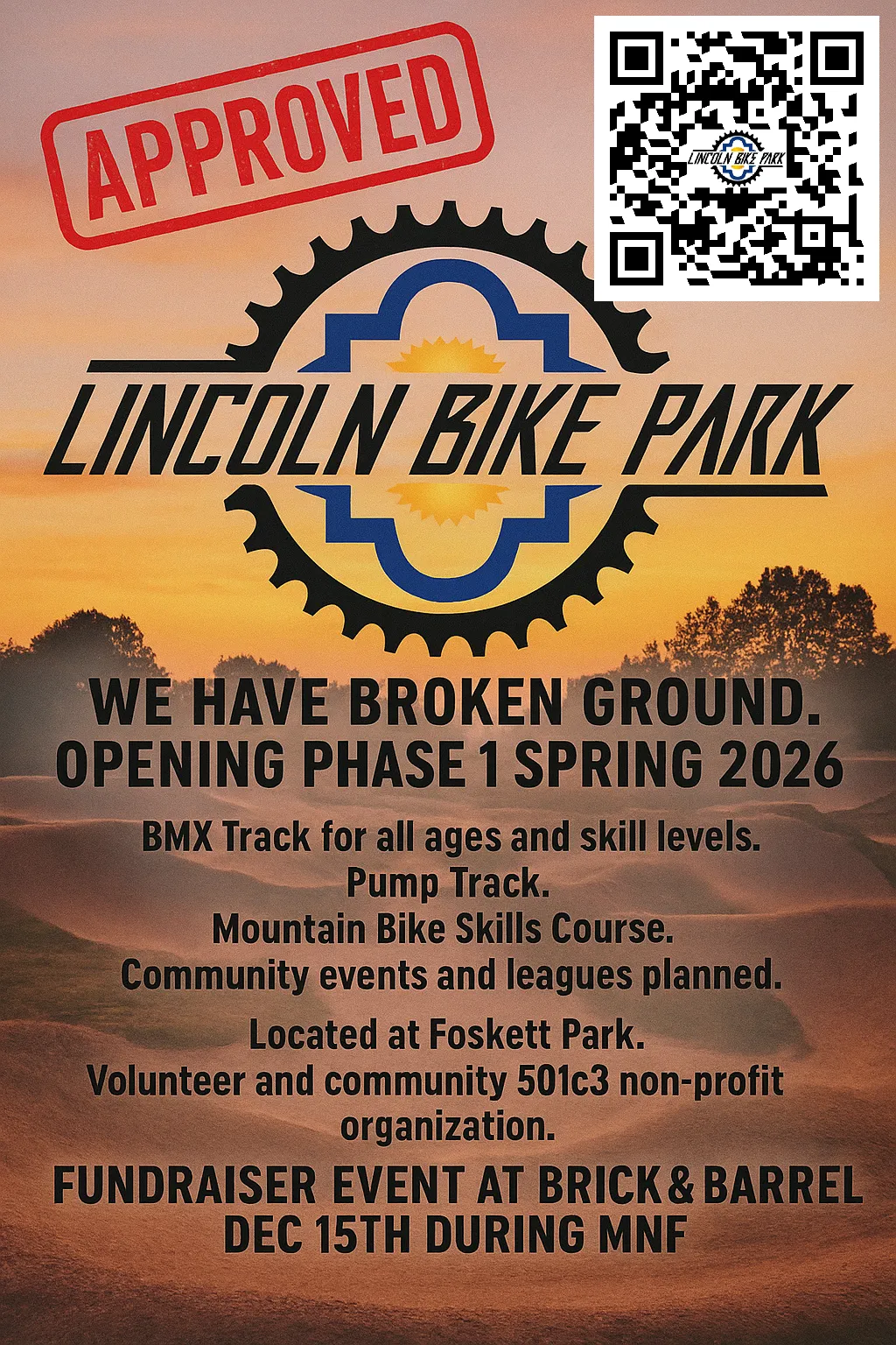 LINCOLN BIKE PARK is a 501C3 non profit project for Lincoln community founded by Jake Pebbles (BMX PRO), Don Jones (BMX Expert), Max Moon (President Lincoln Skate and Bike Association) and will be located at Foskett Park.